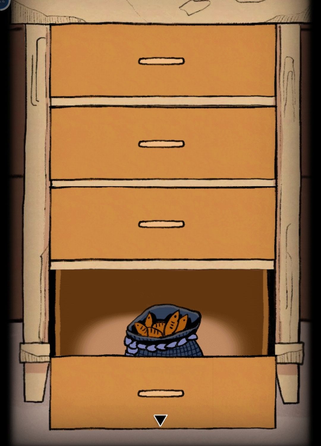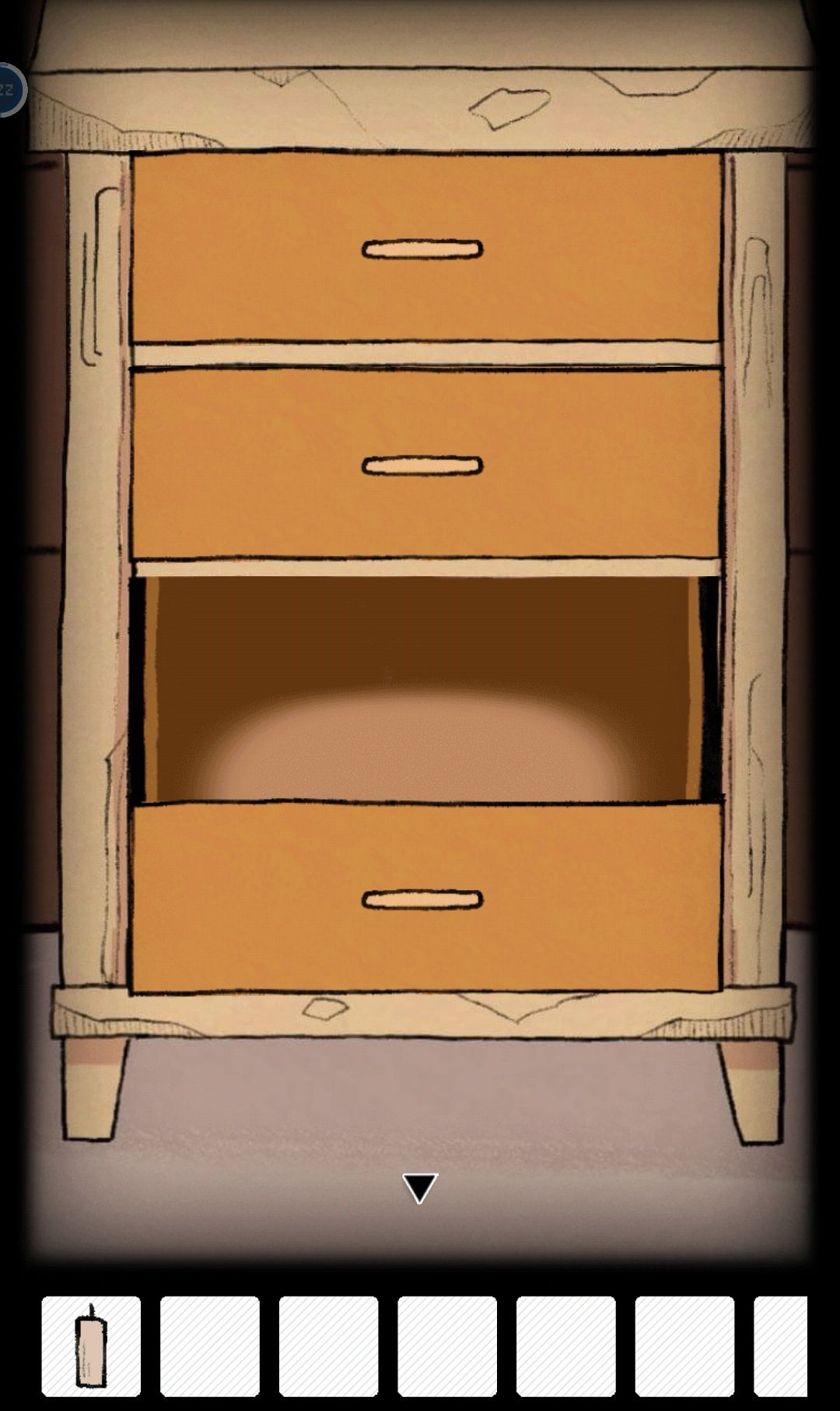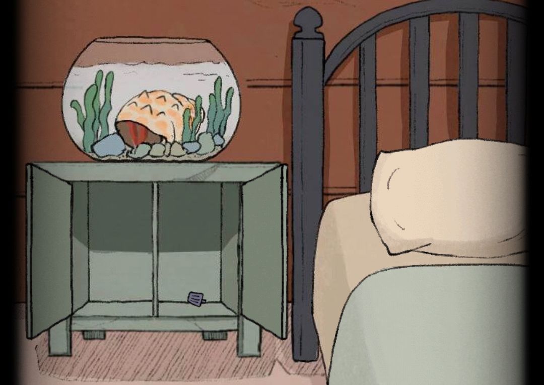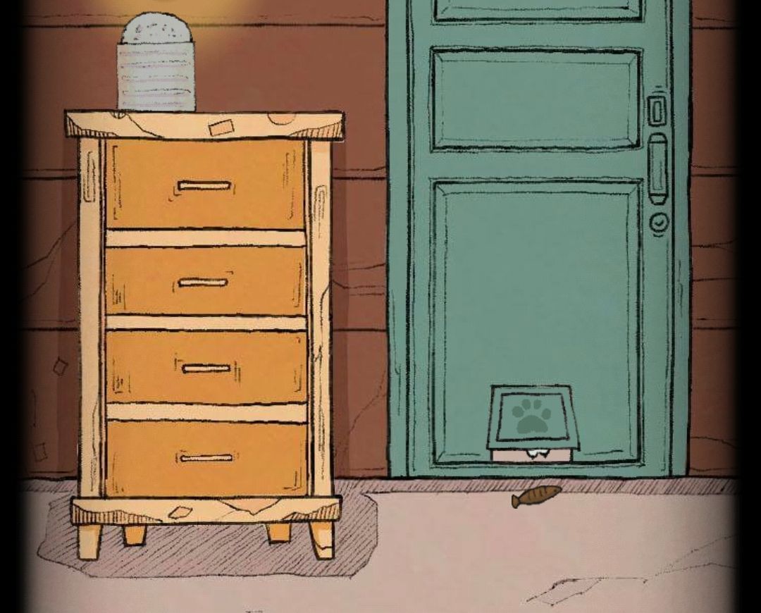 打开烛台下柜子第四格得到小鱼干,将小鱼干放在门下方的小洞口处,会有一只小猫拿走并给到柜子第二格钥匙,打开得到旋钮。