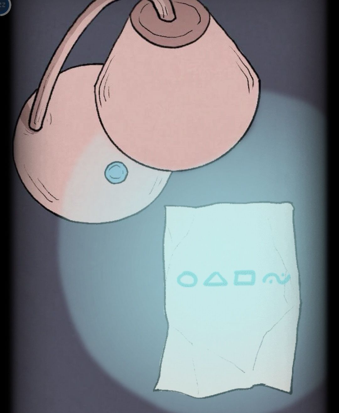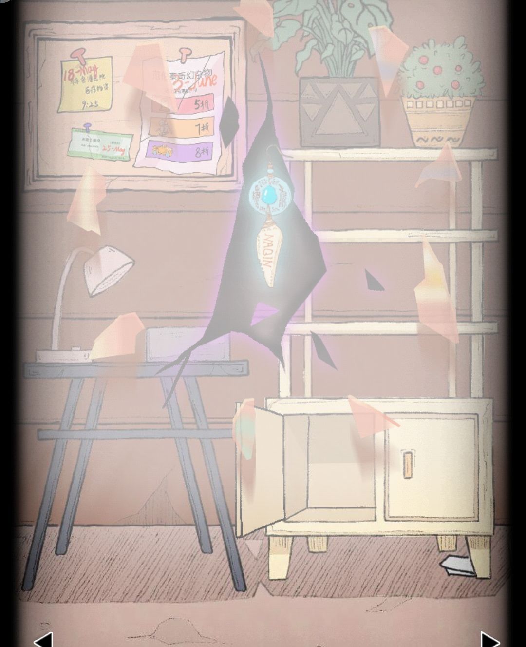 将白纸放在台灯下,点击开关换成蓝灯,纸上会出现四个图案,根据旁边两个盆栽上四个图案,得到下方柜子左侧门四个密码数字8783
