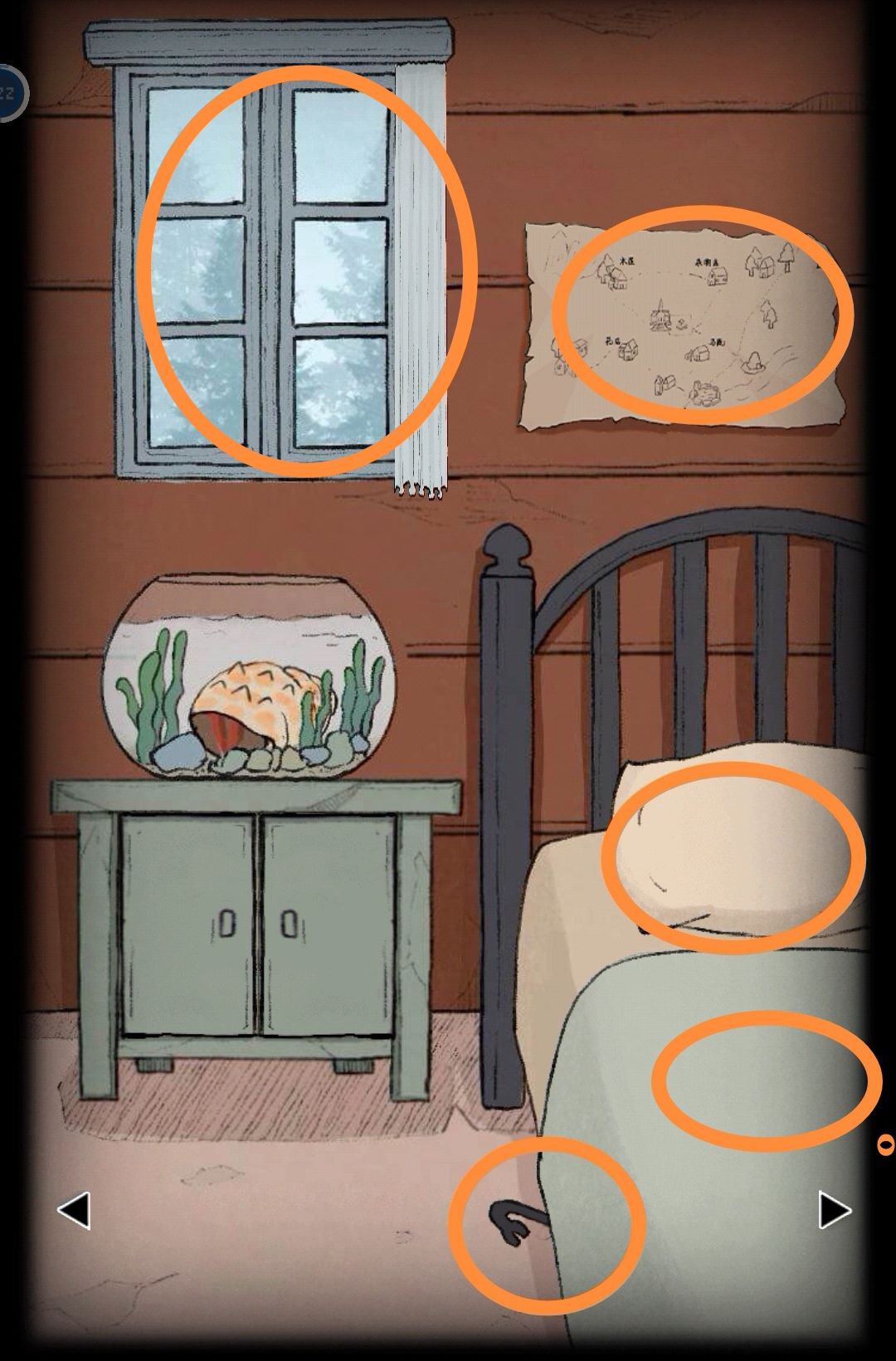 枕头底下是旁边左侧柜子门钥匙,打开得到旋钮;床单底下是一个笔记本,窗帘拉上再拉开有个白纸