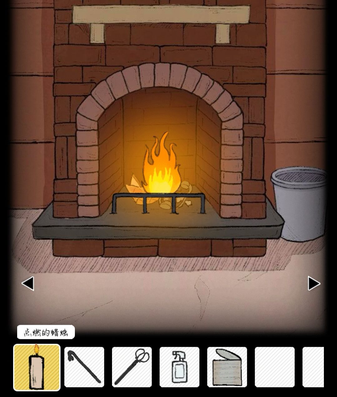 将木雕船扔入烟囱中,后将煤油提灯也扔入其中生火,蜡烛点击火光得到燃烧的蜡烛。将火钳放入火堆,得到床旁边柜子右侧门钥匙,打开得到旋钮。