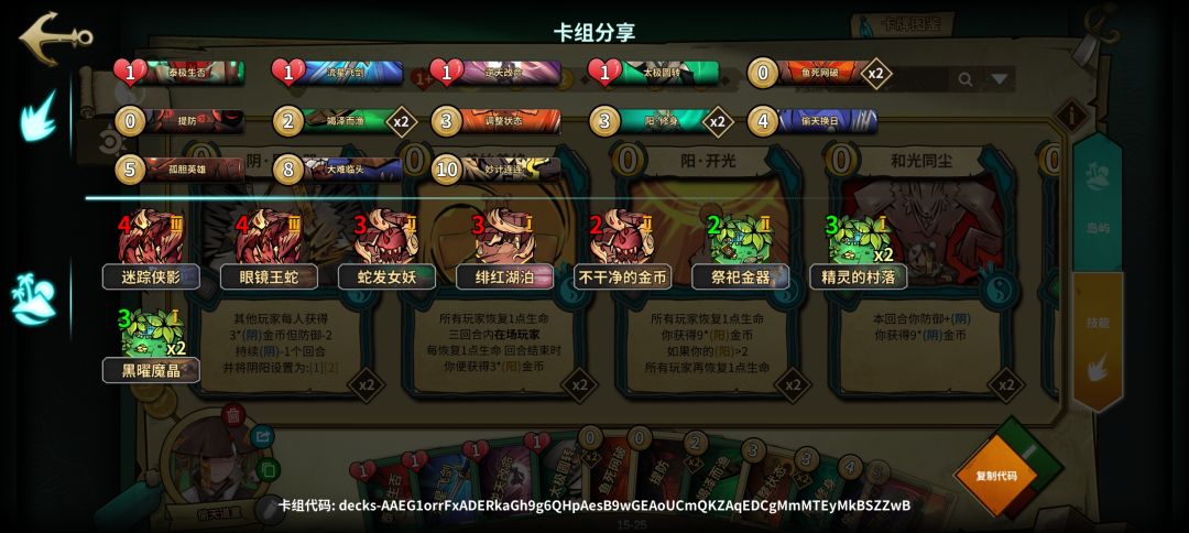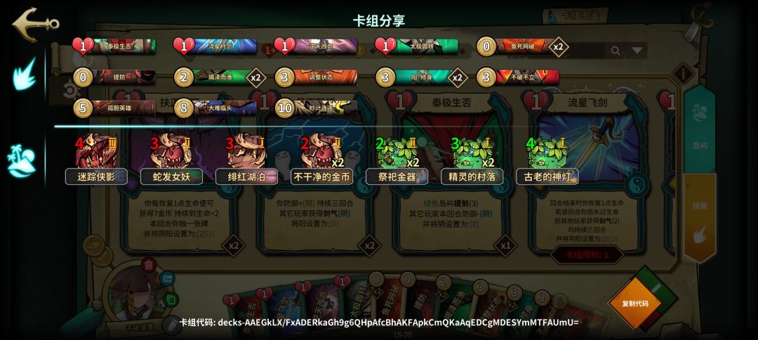 思路2飞剑第一阶段要么前3岛使用而使用条件已经说了要么最后一个岛使用为什么!永远不要把弱点漏出来就算单走可是最后一个岛使用飞剑宁愿少一个回合2剑气,剑气不在多而在精!同理提防前提是身上有阴阳也是最后一个岛使用为什么!我们最后一个岛出下一个阶段可以直接甩鱼丝,卡在手里的鱼丝,永远要么是不会玩的要么是卡组契合度不高的,我这套卡组核心就是鱼丝,鱼丝利用率越高既压制利越强大难和否级都是为了打断其他人的节奏!提防用前置位,后置位拉岛这个还是提一下!