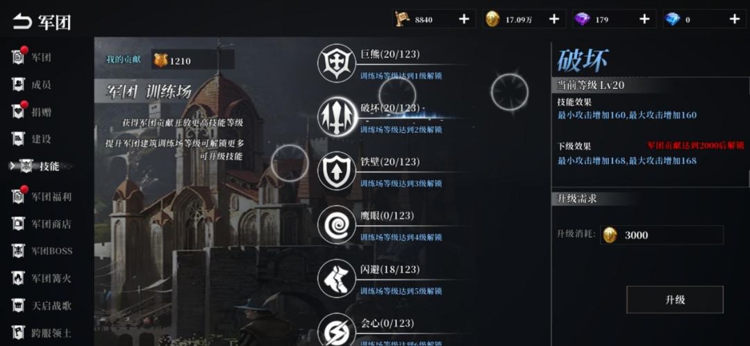 军团技能:当军团训练场建立后,各位天启们消耗金币和贡献值,就可以学习军团技能了。需要注意的是,军团中共有10个技能,每种技能有对角色有不同的属性加成,而军团技能解锁的数量以及技能等级上限和训练场的等级有关,玩家们想要提升技能等级上限的话,训练场的等级就显得特别重要。