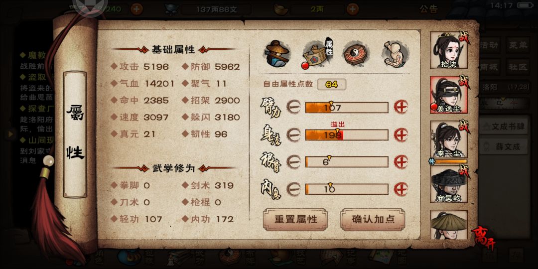 好的好的兄弟们西子加点我搞出来了,带兵器197满身法,六门的兄弟一点一点试吧