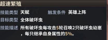 技能描述:所有破坏虫每攻击5轮召唤2只破坏虫幼崽,每只继承自己的属性5%。