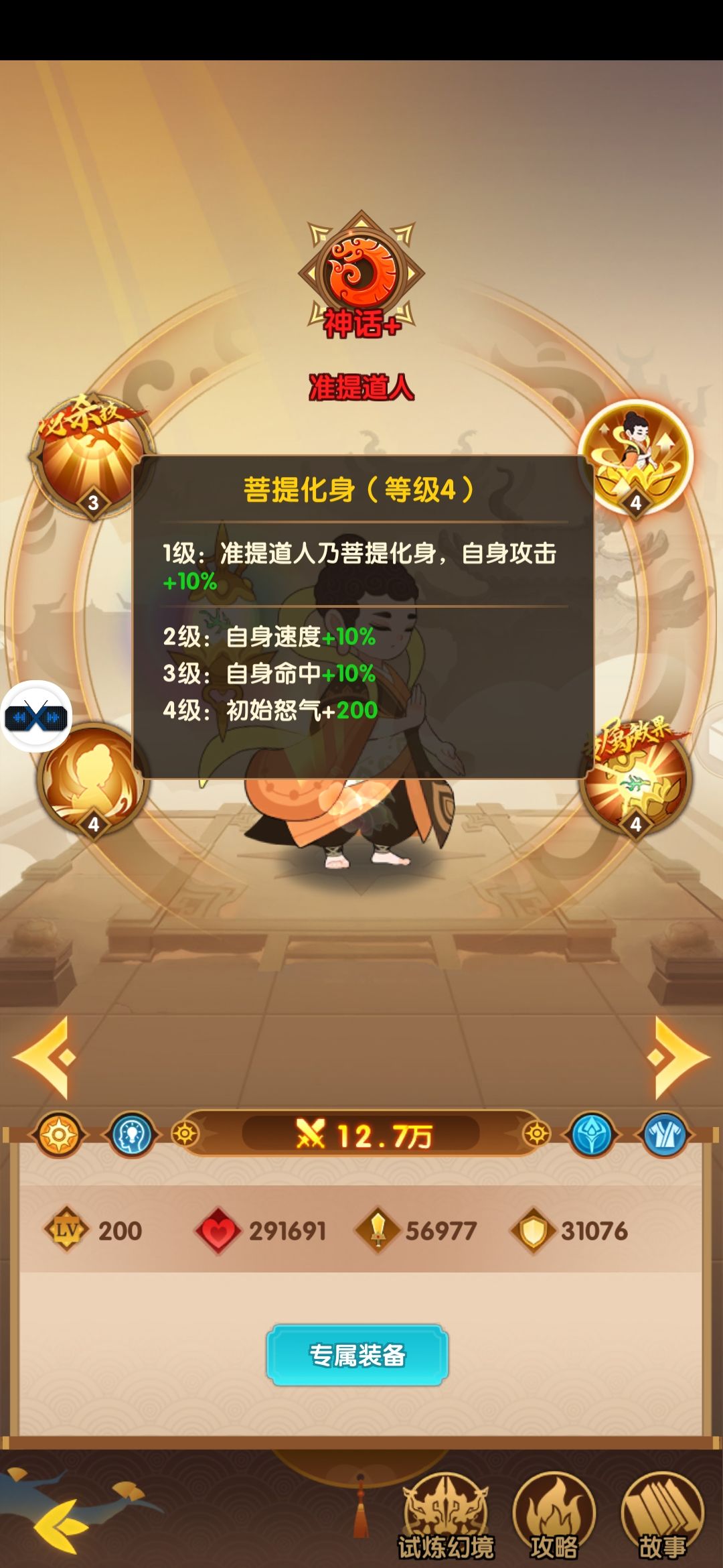 1级:准提道人乃菩提化身,自身攻击+10%