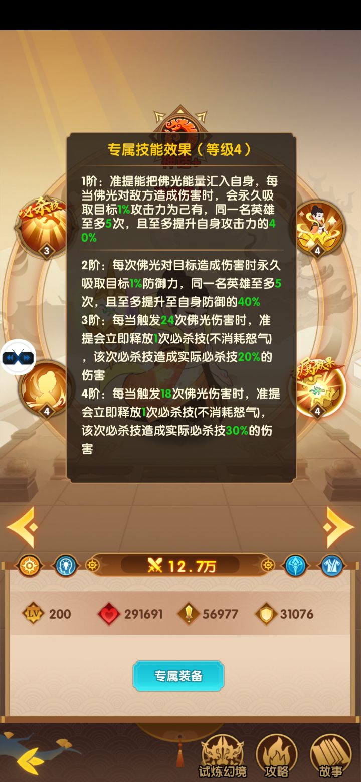 2阶:每次佛光对目标造成伤害时永久吸取目标1%防御力,同一名英雄至多5次,且至多提升至自身防御的40%