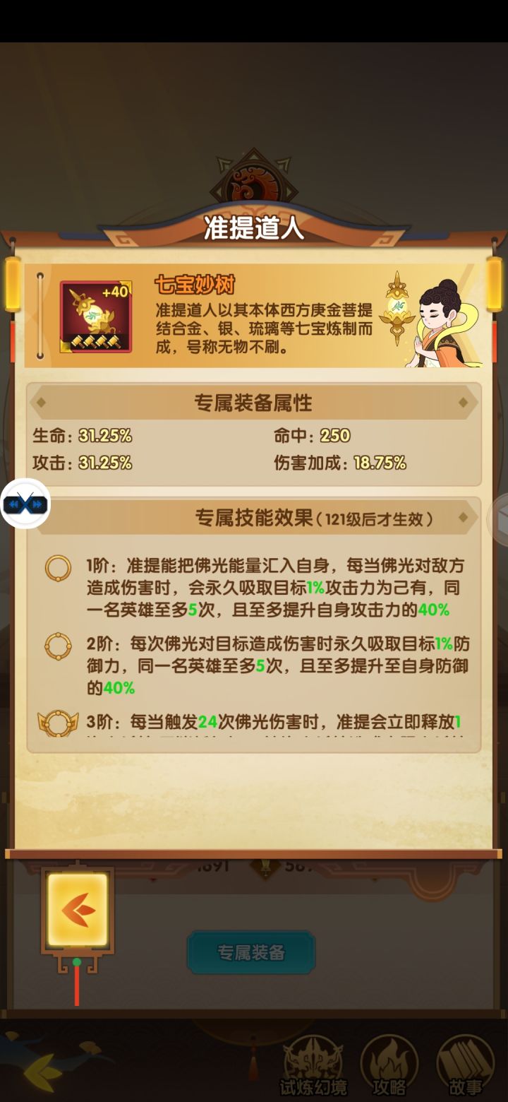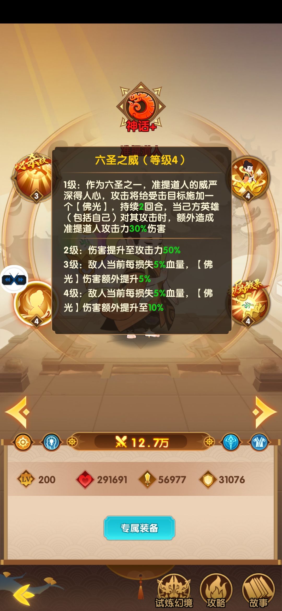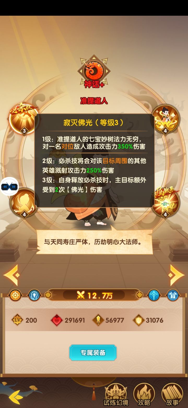 1级:作为六圣之一,准提道人的威严深得人心,攻击将给受击目标施加一个【佛光】,持续2回合,当己方英雄(包括自己)对其攻击时,额外造成准提道人攻击力30%伤害2级:伤害提升至攻击力50%