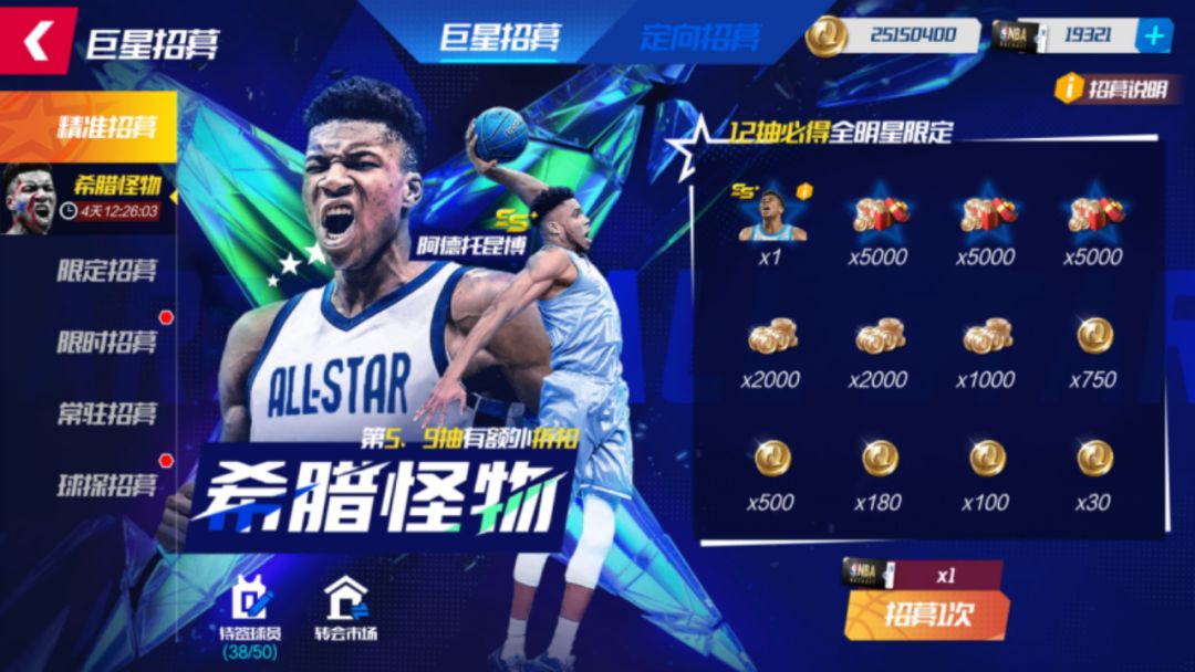 活动期间,可使用在【精准招募函】在【精准招募-希腊怪物】池中,招募全明星队扬尼斯·阿德托昆博。