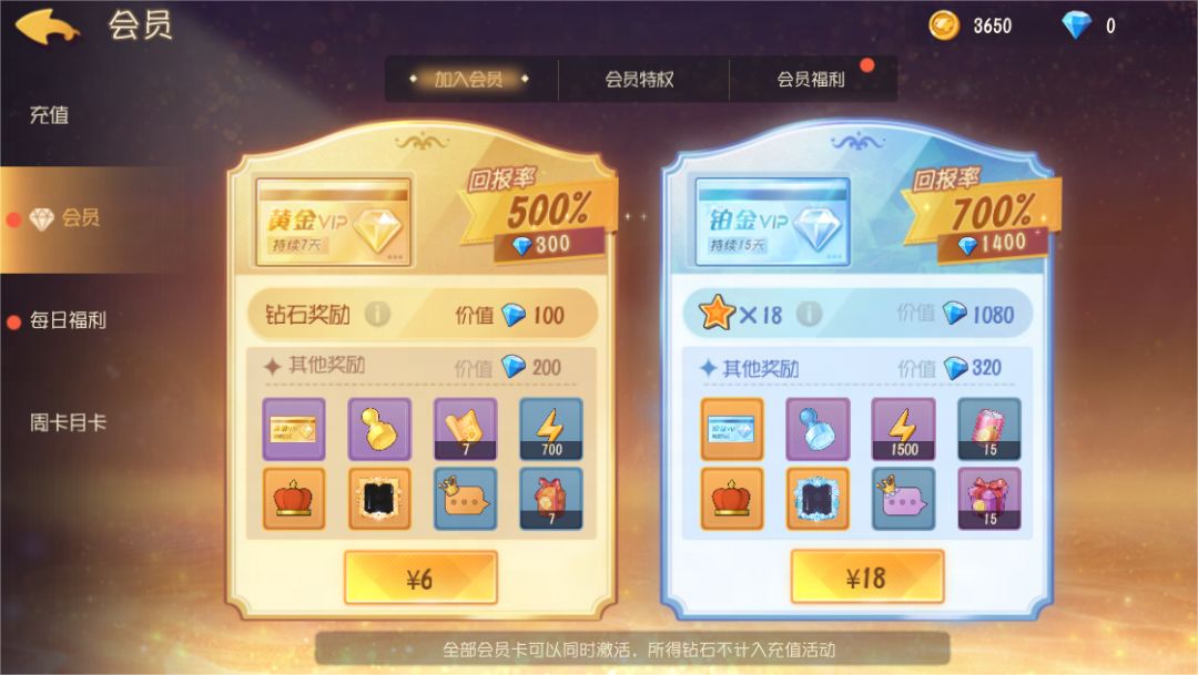 以上所有会员卡,小伙伴们都可以同时激活哦,只是所得钻石将不计入充值活动中。