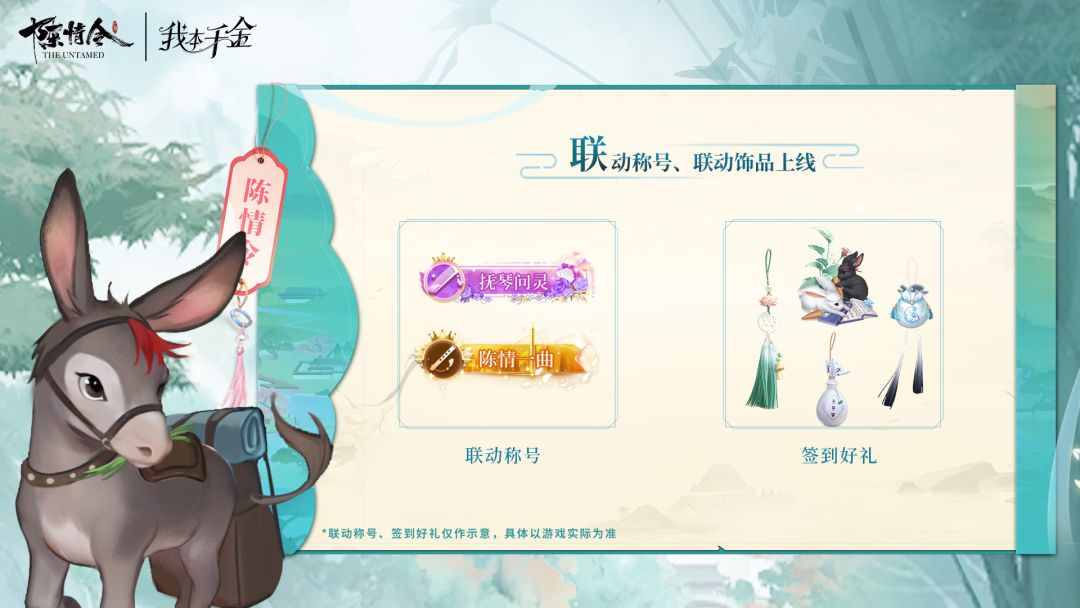 你可以收集魏无羡的小毛驴“小苹果”,让它作为小伙伴陪伴在身边。联动期间,连续签到还可以免费领取手持物-锁灵囊、面饰-蓝氏抹额、手持物-莲藕吊坠、手持物-兔子灯笼等专属道具!那些拥有特别纪念意义的联动配饰,各位小令牌们千万不要错过!