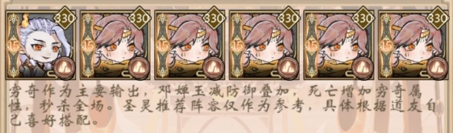 这套组合优势在于只需要全力培养1个单核,5个工具人全靠送,极致不讲道理的性价比为后期转型光暗等阵容节省了大量的资源时间。穷奇的妖灵技能选择22221,法宝选择加攻击的,玉璜选择暴击爆伤,星宿先每个点1级提升最大,后面再慢慢升。