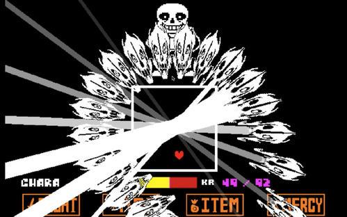 sans的boss战是全游戏难度最大的,每单个骨头碰到后,会造成持续的中毒伤害,还有的特有的攻击方式“龙骨炮”,会向前方射出一条直线,同样碰到后也会造成中毒伤害,并且是全游戏中唯一一个受伤按照帧数来计算的boss,在他面前,完全没有“无敌时间”这一说法。