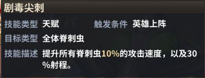 技能描述:提升所有的棘刺虫10%的攻击速度,以及30%的射程。