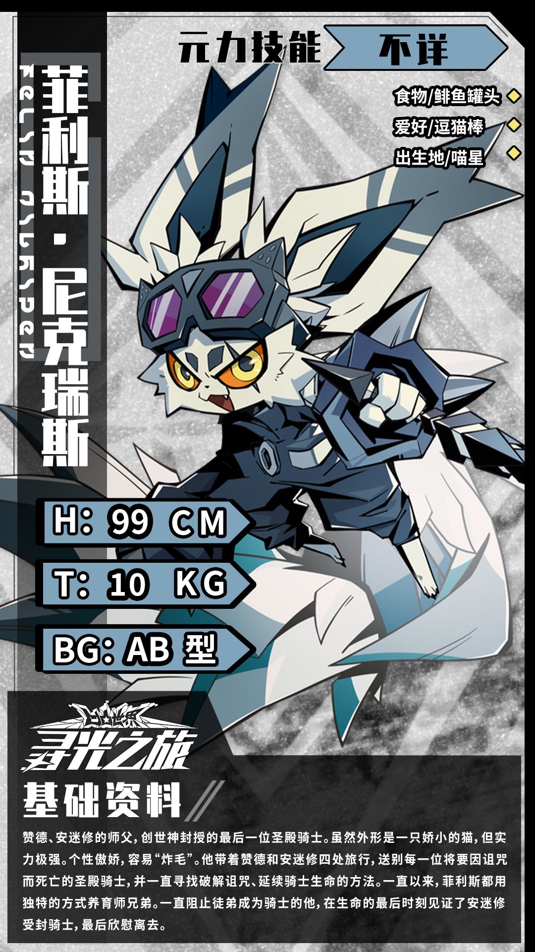 赞德、安迷修的师父,创世神封授的最后一位圣殿骑士。虽然外形是一只娇小的猫,但实力极强。个性傲娇,容易“炸毛”。他带着赞德和安迷修四处旅行,送别每一位将要因诅咒而死亡的圣殿骑士,并一直寻找破解诅咒,延续骑士生命的方法。一直以来,菲利斯都用独特的方式养育着师兄弟,一直阻止徒弟成为骑士的他,在生命的最后时刻见证了安迷修受封骑士,最后欣慰离去。