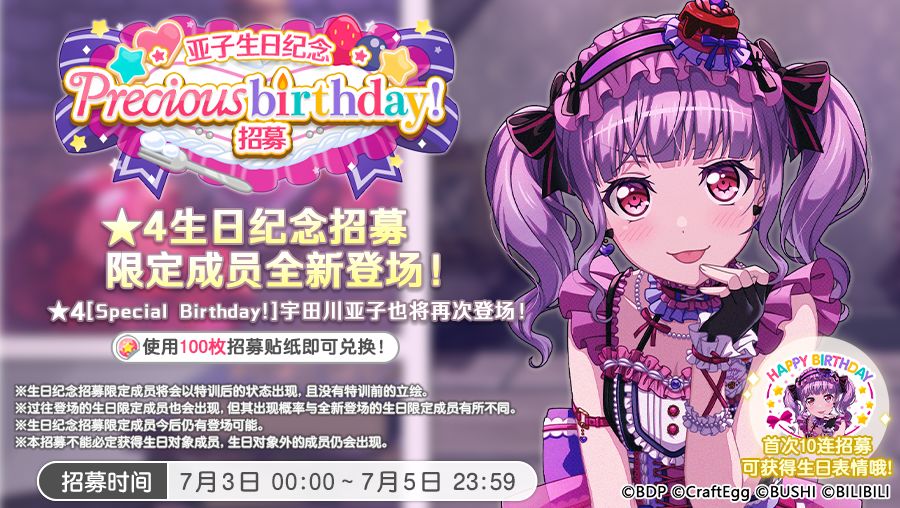 ※在本招募中出现的包括「★4宇田川亚子[Precious birthday!]」在内的所有宇田川亚子成员都将会比同稀有度下的的其他成员出现概率更高。同时,「★4宇田川亚子[Precious birthday!]」将比包括再次登场的「★4宇田川亚子[Special birthday!]」在内的其他宇田川亚子的★4成员出现概率更高。