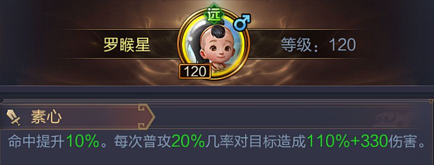 他的性格能为自己提升命中属性,并让自己的普攻附带额外的伤害,妥妥是个输出子嗣的候选人。但因为来得晚,前期的属性差不是一时半会就能弥补的,如果刚来就直接把好用的输出技能学了,那么在实战中伤害就会很轻易的被敌人闪避掉。所以他的技能搭配就要像月魁星一样经历两个阶段,在第二个阶段才能确定最终的发展路线和技能。