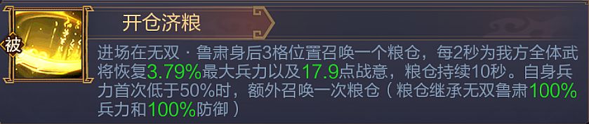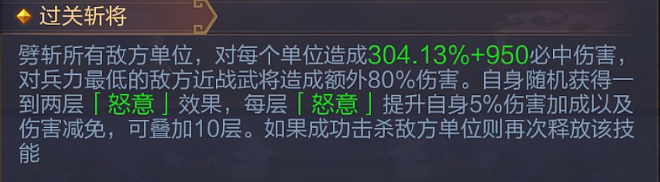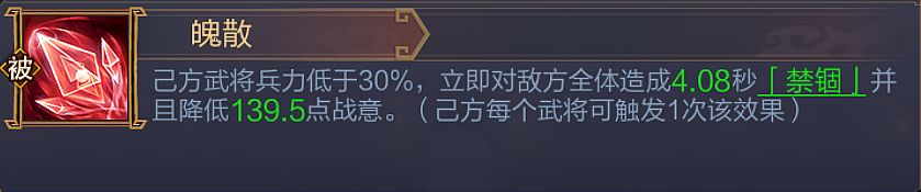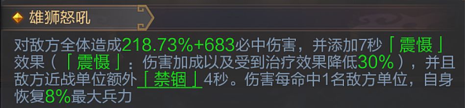 - 根据技能强度表的顺序,你会先看到无双张飞的推荐优先级很高,找到他的技能解析后可以发现:该技能不仅能削弱敌方的输出和回血,还能禁锢近战目标4秒,更能为自身提供回血(满额回40%的最大兵力,很顶!),妥妥的多效合一高性价比技能,非常适合胖子学习。