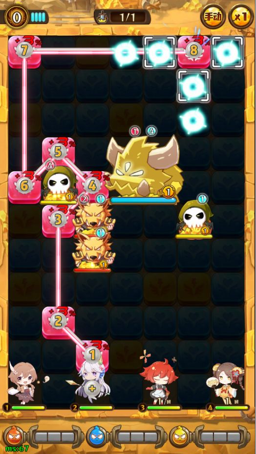 直殴攻击是一种强大攻击方式,可以对一个怪物进行多次攻击。怪物身这一圈会有多个方块比如说最左侧怪物的十字方向(上下左有)相邻有4个红色块。