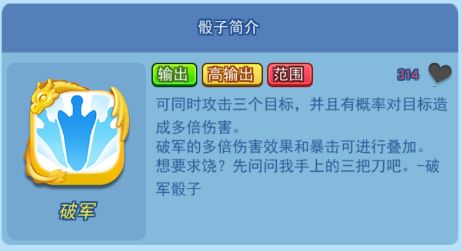 和核弹一样,破军在前中期属于比较强力的传说骰子,有群体攻击和多倍伤害。