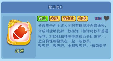 核弹骰子应该是大家获得的第一个骰子,这个骰子的实用性很强,会陪伴我们较长的一段时间。