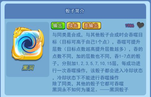 黑洞骰子可吞噬其他目标来提高自身层数,理论上拥有无限高的攻击力,无论是在排位还是合作中都有超高的强度。