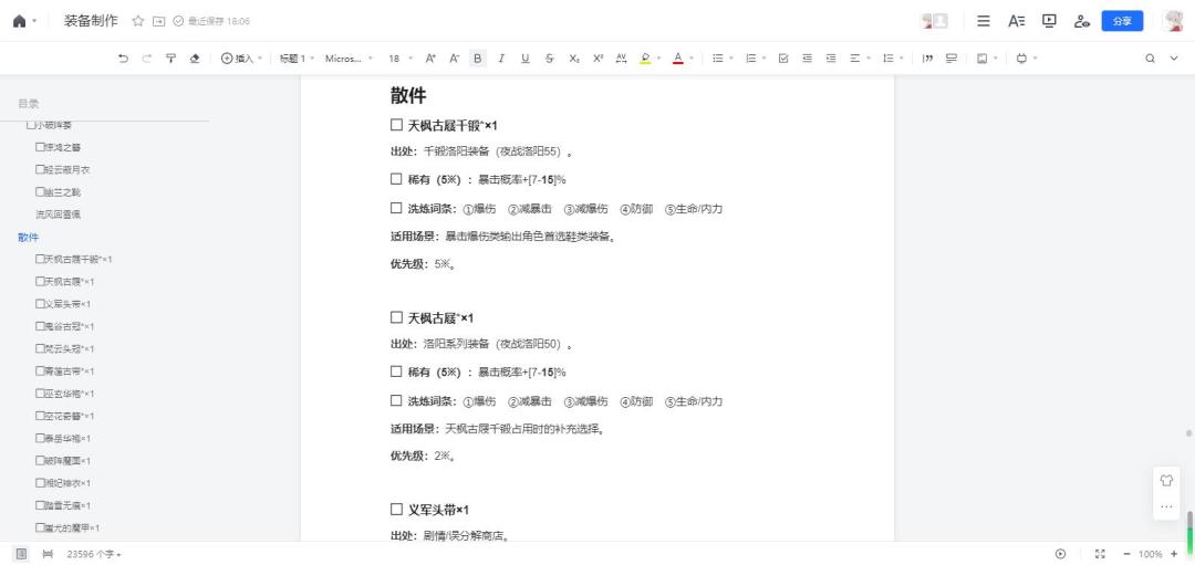 文档特色:涵盖汉家江湖当前版本几乎所有主流配置的需求装备,依照表格制作装备可以满足至少95%的装备需求,使用勾选框来确认装备制作进度,以后再不需苦恼要洗什么装备了。同时附上装备与稀有的刷取优先级、适用场景举例和对装备的分析,对新手入门更为友好。