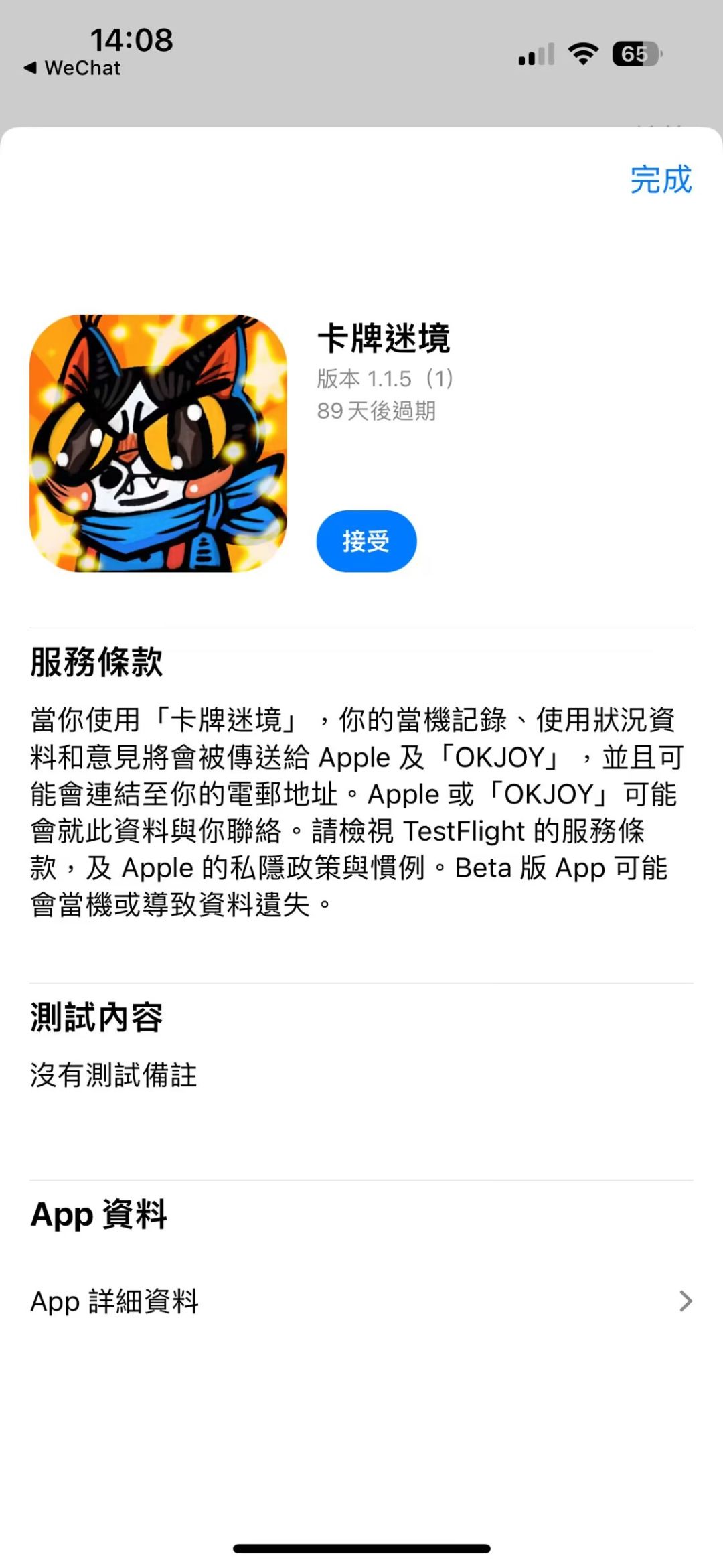 3. 这将打开TestFlight应用,你会看到你被邀请测试的游戏,点击"接受"。
