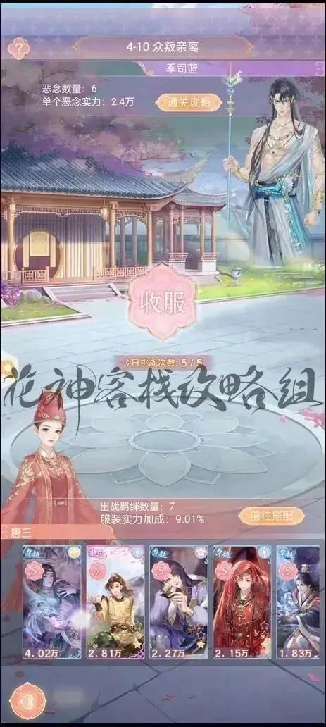 我们可以根据提示换上符合洋气、异域、绛裳三个TAG的装扮,提升服装的实力加成。并将至少3张羁绊卡实力提升至24000以上即可战胜季司蓝。