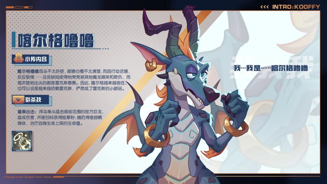 永远不要以貌取人,也永远不要以貌取龙!就好比,在许多人、许多龙眼里,喀尔格噜噜听力不太好,眼睛也不太好,行动迟缓,反应还特别慢……但一旦上了战场,他的战斗力基因就将被瞬时激活到时候,你就知道“拳能碎巨石,脚能踹倒树”是什么滋味了哦,对了,差点忘记说了——在他重拳出击的同时,他还能让自己的生命值得到恢复!相!当!过!分!