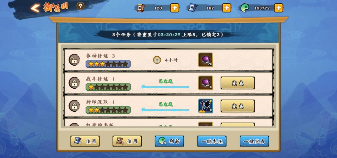 御茶园,每日和小组,我建议每天完成一个四星加两个一星或二星,别的都留着不完成(只你派遣去做但是不要收取),然后有活动会让你做四十个御茶园,这时候存着不完成的任务就派上用场了,五六七星任务留着看月度挑战