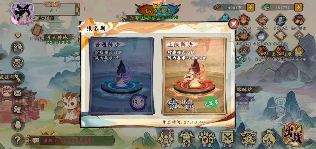 仙阵斗法,一百二十级就能报名,然后参战,等着拿奖励