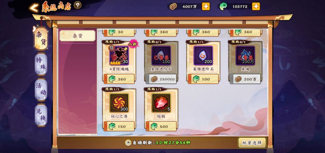 杂货商店每天一百五一个黄券必买,别的我建议只买挑战书,英魂和进阶石