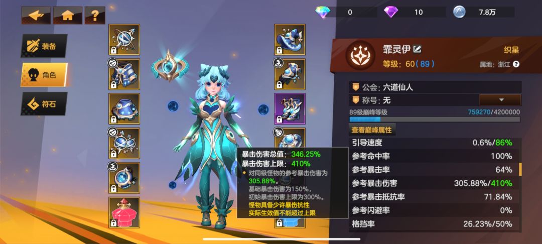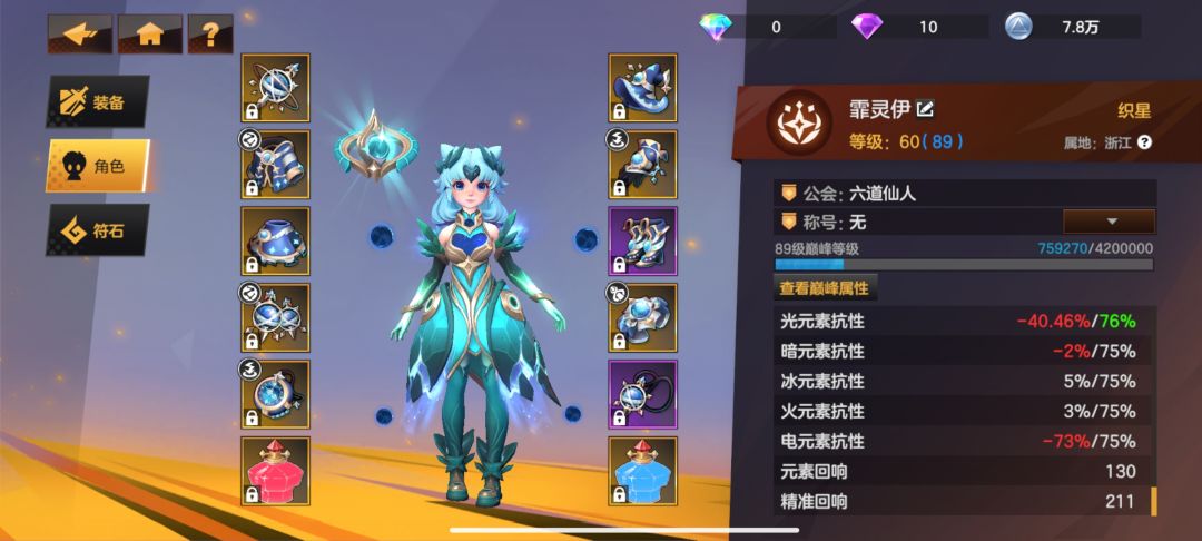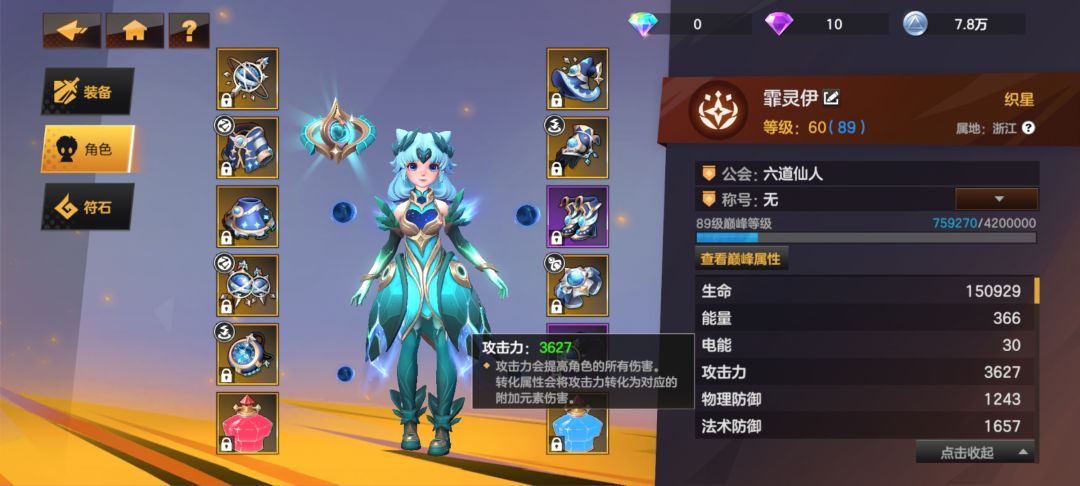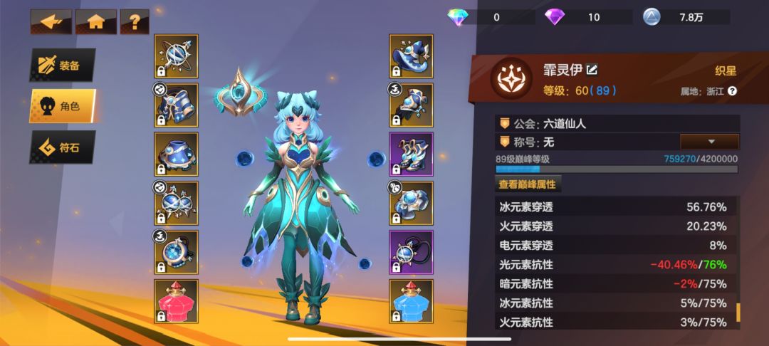 装备词条就不说了,只要2技能冲击波能吃到的都是有效的,可以查看排行榜角色:霏灵伊目前巅峰85级,参考契约石和装备词条。