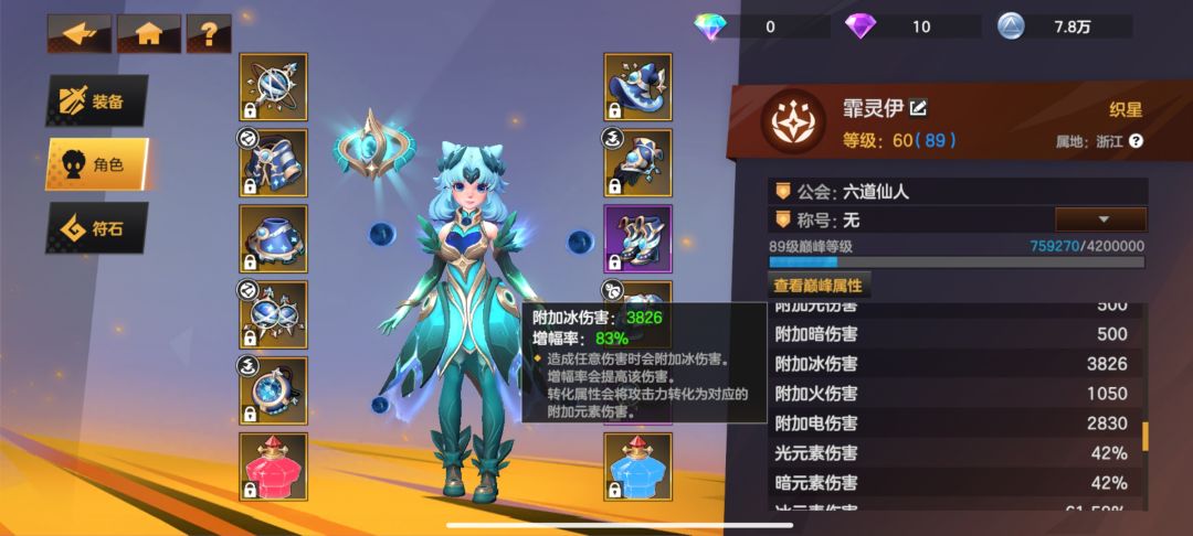 附个人面板,之前附加冰伤应该是7000多,过了十几个小时,略有不同