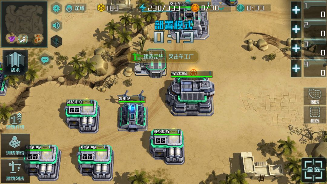 喜欢玩飞机的指挥官们每局都要生产很多飞机来进行攻防,所以各位不妨试下此实战技巧。开局还是走正常流程,唯一不同的是前几分钟不做兵,攒出来的资源点拿去升级指挥部,这样两分钟左右就能将指挥部升到二级,升级后利用资源点建造空军工厂(有兵营和突击车工厂的前提下才可建造),最好建造两座。