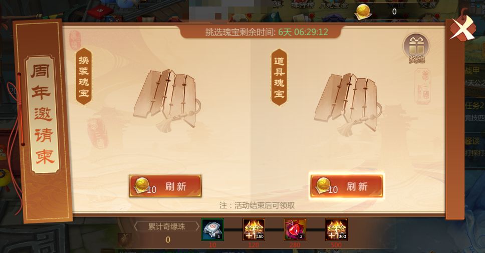 大家获得奇缘珠后,可在周年邀请柬中刷新挑选自己想要的奖励。