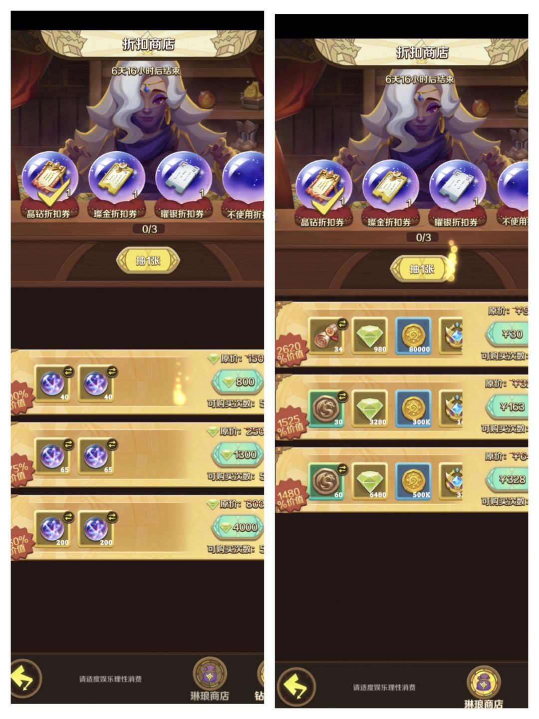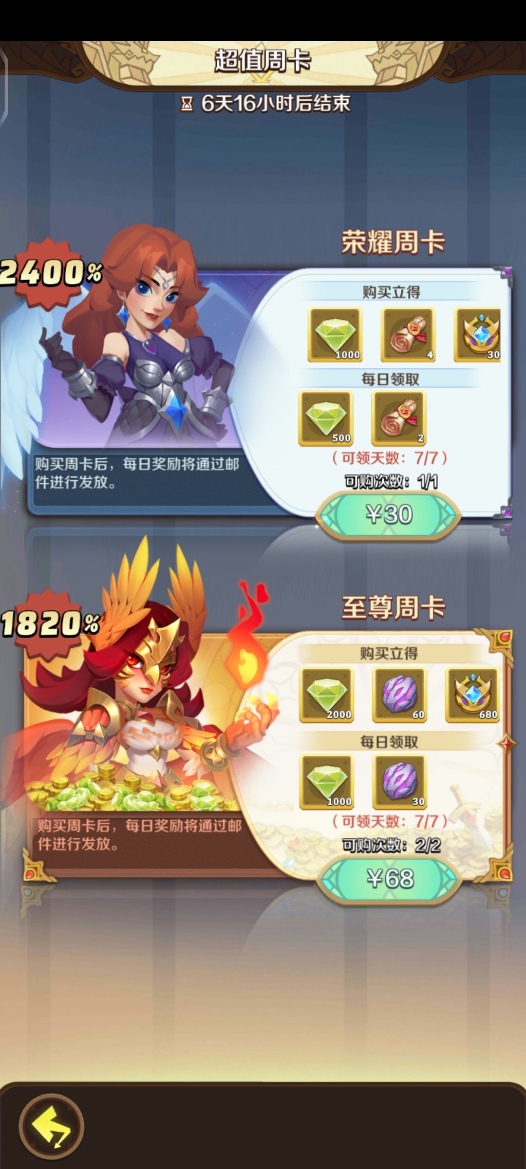 至于氪金折扣礼包的话,性价比高于平常的礼包但略低于刚刚的周卡奖励~当然啦,氪金大佬可以全买,肯定是不亏的,但微氪玩家就要精打细算到每一分钱啦~
