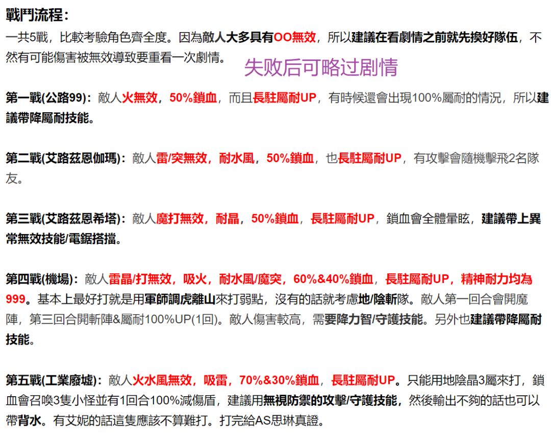 ③注意优先级,弱>耐>吸收>无效。例如4战,火魔法为耐性,不是吸收,所以卡里尤可用。
