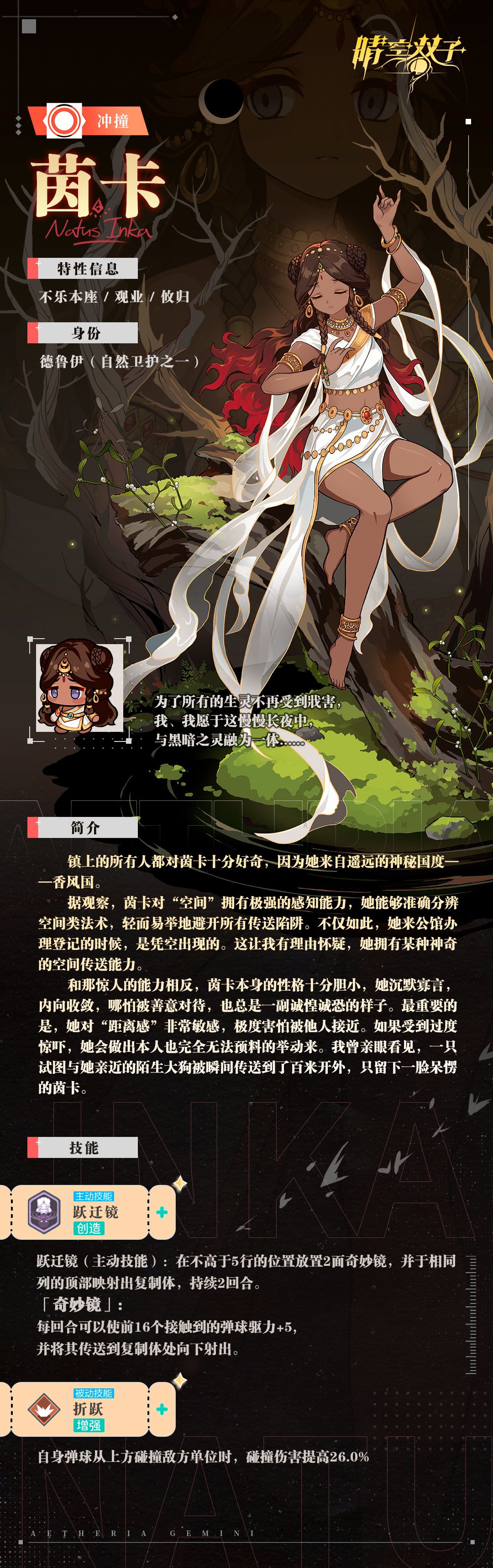 听说,茵卡来自香风国乾达哈拉村,现在则作为德鲁伊,在巨藤上流浪。其冒险经历不为人知。会忽然出现在受伤的冒险者面前,给予一定帮助和指引之后,再默默消失。