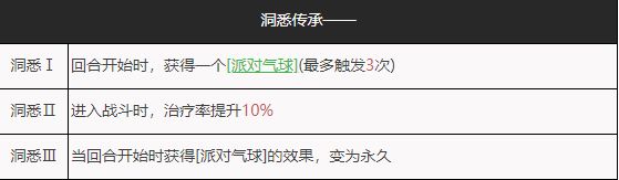 洞悉二时,气球派对获得被动:进入战斗时,治疗率提升10%。