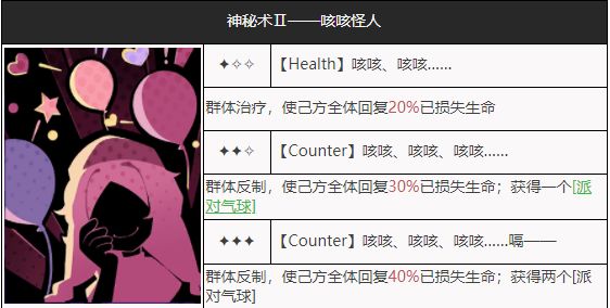 极其一言难尽的神秘术,气球本身攻击面板就非常低,还给了气球一个纯打伤害的神秘术I,说实话气球派对的一技能的确是很多人诟病的一点。“气球派对与六星最大的差距就是气球派对有一个小技能是完全没有用的。”你要是能和兔毛手袋一样可以施加DEBUFF,还能触发好奇心宝贝,好歹能加点治疗覆盖率。玩过气球的玩家都知道气球派对的神秘术I几乎打不出伤害,在对局中还经常污染手牌,卡手的时候堪称非常难受。该神秘术即使拥有50%的穿透率但也是面对高难敌人时难以打出理想伤害,所以我个人对于该神秘术I也是没有值得深入介绍的,大家体验一次就不会想再用了吧(大概)。