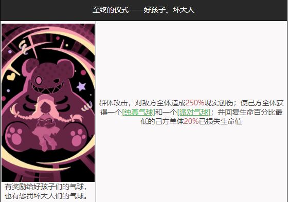 至终仪式的倍率在这里就略过了,玩过气球派对的玩家都知道气球派对的伤害还是比较一言难尽的,再加上气球派对的角色定位,因此没必要分析具体倍率。额外效果为使己方全体获得一个[纯真气球]和一个[派对气球];并回复生命百分比最低的己方单体20%已损失生命值。