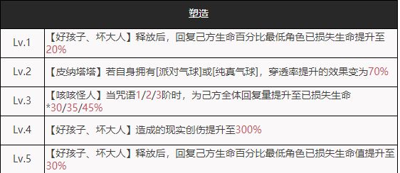 作为一名治疗系的角色,气球派对的塑造中对于已损失生命值百分比的提升相对而言还是非常大的,因此气球派对的塑造一、三、五的相对而言还是用处很大的。气球派对作为一位五星角色,在未来肯定是慢慢歪到满塑造的,因此大家没有必要为了气球派对的塑造专门去下某个池子,零塑造的气球派对的治疗量在目前的环境下还是十分足够的。