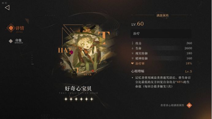 六星心相没什么好说的,即使气球派对吃不到好奇心宝贝的心相特效,但是好奇心的基础属性和基础特效在六星心相中还是比较适合气球派对的。在你另一队的六星治疗角色有好奇心宝贝时,气球派对可以直接拿来用就完事儿了,不需要考虑那么多。