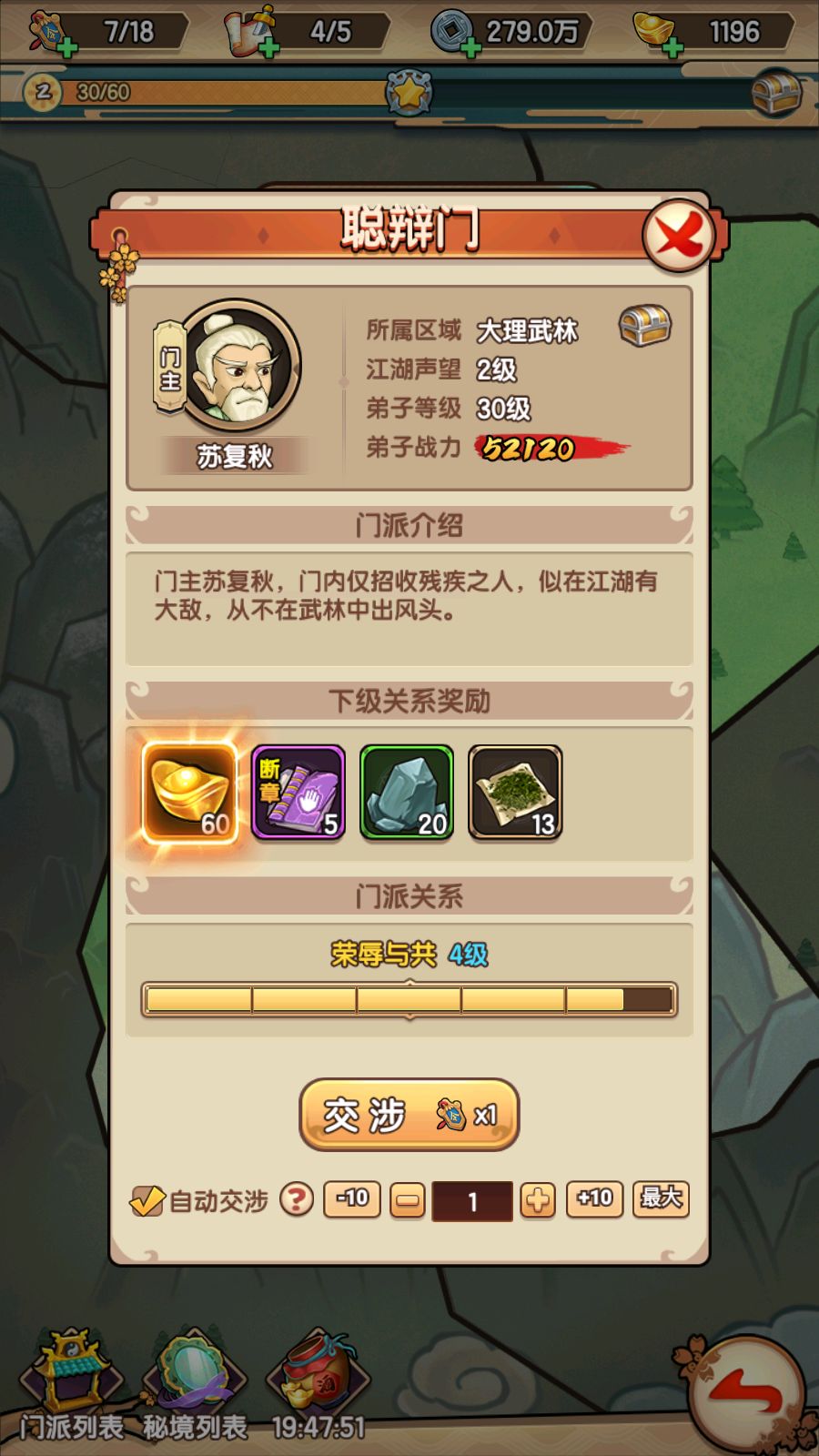2、江湖门派:选择江湖门派开始交涉,可逐步提升门派关系,最终征服该门派,关系越高奖励越丰厚。