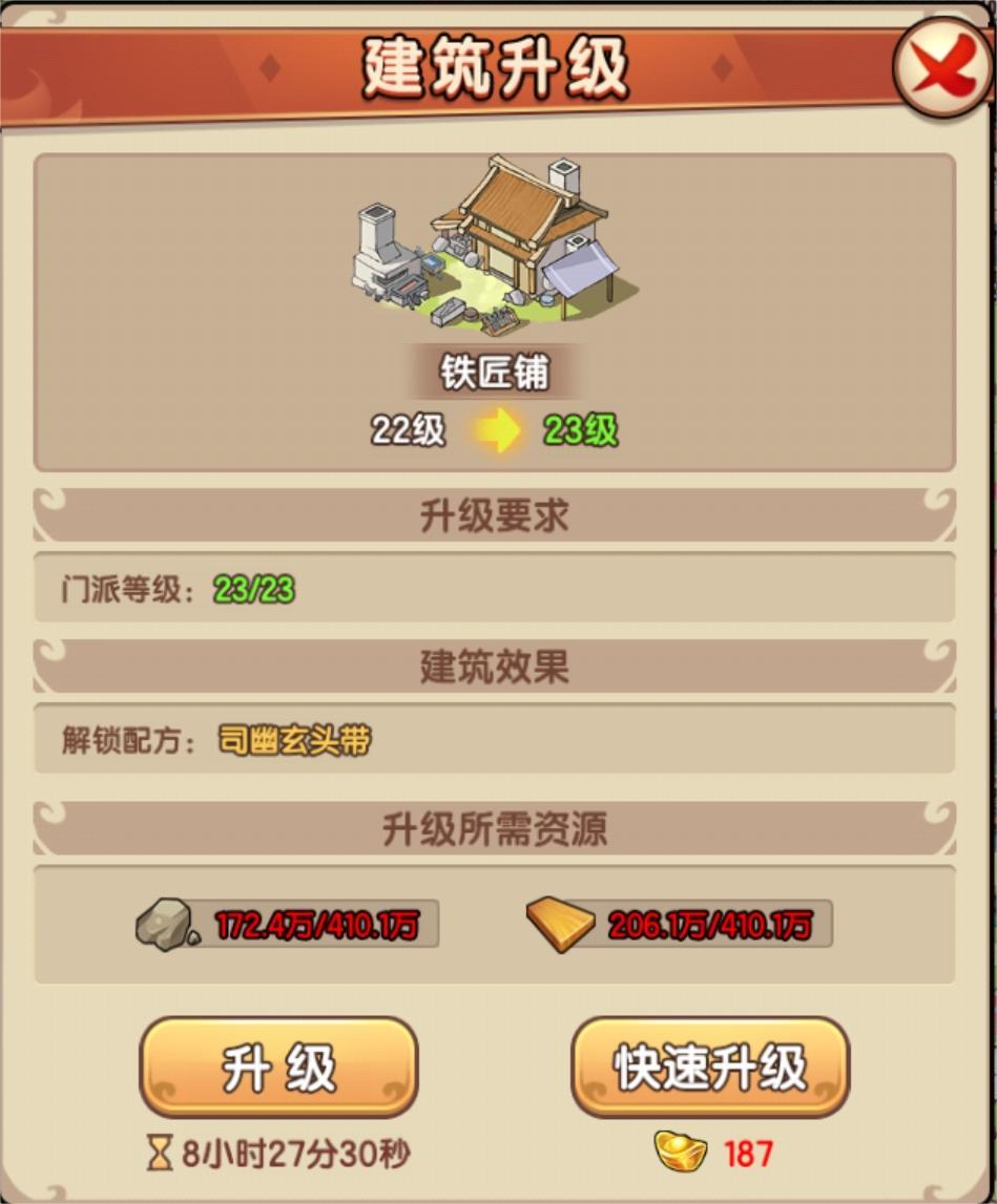 3、资源产出栏:门派建设资源产出的基本信息,产出速度加成。