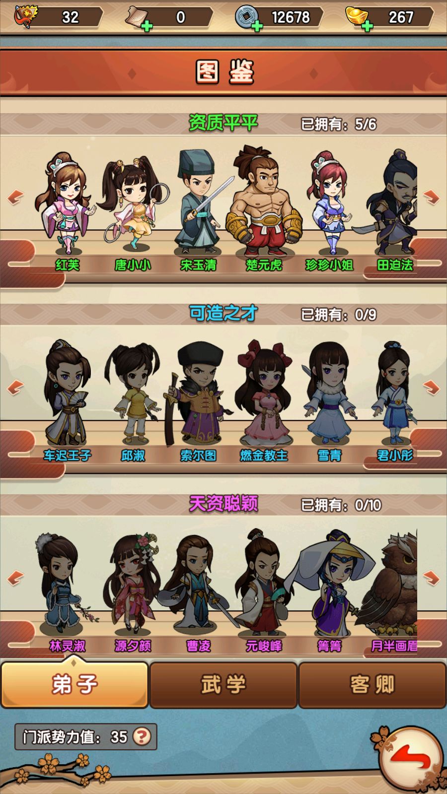 (3)图鉴:可查看弟子、武学、客卿的获取方式以及基本信息。