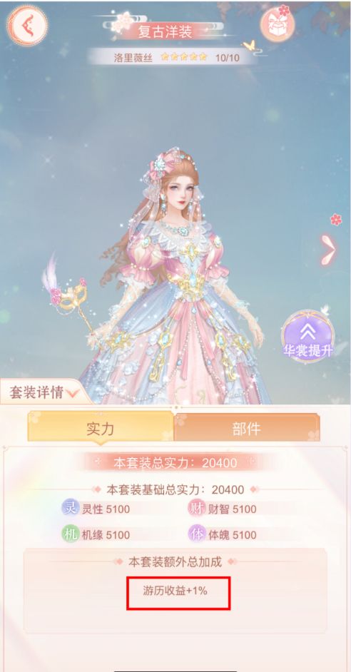 当然,集齐特定的套装也可提高游历收益哦!那么有哪些套装可以提高游历加成呢?据小小了解:目前可以提升加成的套装只有一套:复古洋装-洛里薇丝,此套装可在游历行装的基础收益加成上,再获得1%的收益加成,仙主大人若是对此套装进行注灵或者升阶,额外收益的加成也是会不断随之提升的哦!