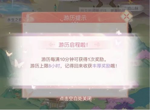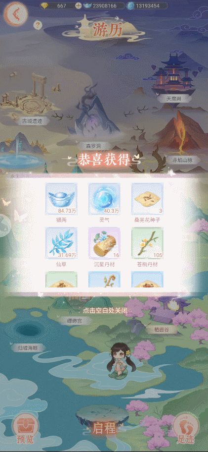 在游历界面点击“启程”,将随机前往已解锁的不同地点进行游历,每次游历的上限是8小时,仙主大人们可点击“足迹”查看已收集到的材料。每个游历地点产出的资源各不相同,有银两,灵气,仙草,更有一定概率获得各类珍稀物品,每个地点游历满10分钟即可100%获得必得奖励,若游历未满10分钟则无法获得奖励哟~