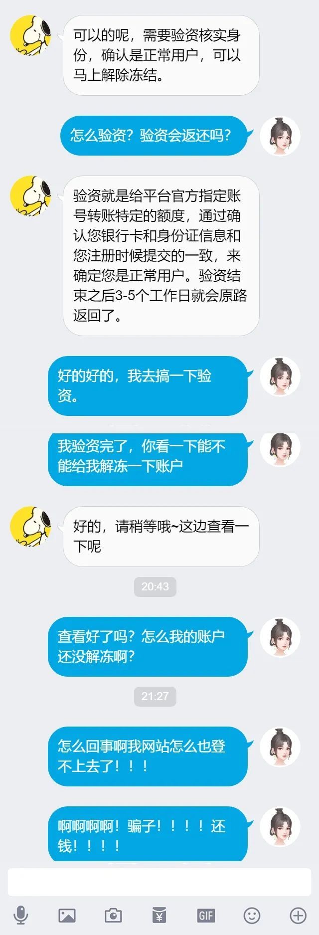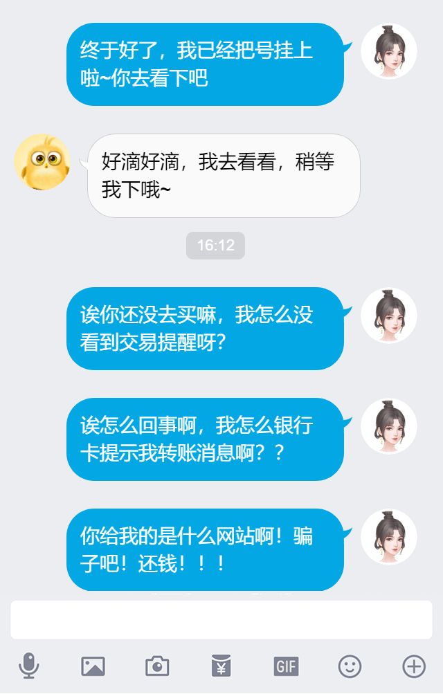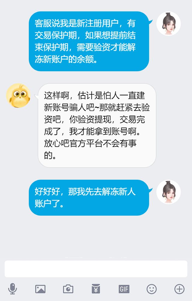 骗 术 2 —— 账 号 买 卖近日游戏内或官方交流群内出现部分账号交易的违规信息,不法分子通过私聊的形式,出高价购买账号,并让玩家登录对方提供的钓鱼网站进行交易,交易过程中可能会修改您的游戏账号密码,并以解冻资金等借口需要您进行转账解封,甚至会以报警处理进行恐吓。